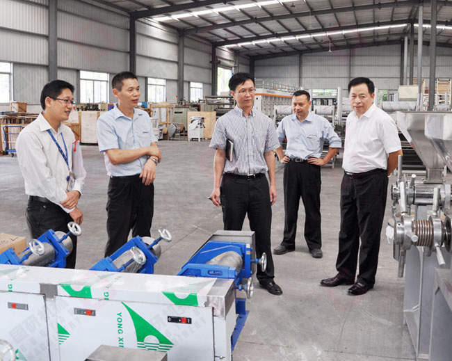 李局長一行來到公司就深入車間了解生產(chǎn)情況,在河粉機(jī)裝配車間李局長詳細(xì)詢問了河粉機(jī)的功能原理和價格,當(dāng)?shù)弥獓信坪臃蹤C(jī)占領(lǐng)了國內(nèi)主要市場時十分高興。李局長一行還在公司黨支部活動室觀看了廣州電視臺播出的報道我司開展黨建工作的《紅棉璀璨》專題節(jié)目,隨后開展了討論,對我司黨建工作開展的有聲有色給予了高度評價。