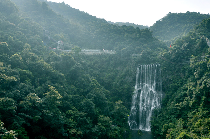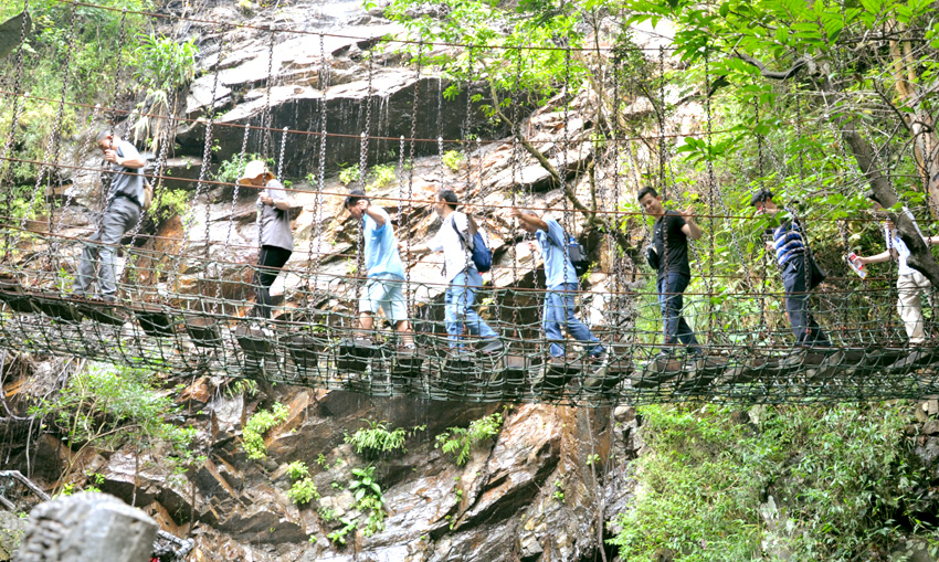 兩小時的小北江之游,大家都還余味未盡。導游又帶上大家趕往這次團建活動的重頭戲的目的地:古龍峽的“云天波霸”。今天公司參加團建的所有員工都要挑戰(zhàn)目前世界上較寬的高空玻璃橋,玻璃橋像一條通體透明的巨龍連接著峽谷兩岸,橋下懸空超過100米,站在橋上向下看,真是令人心驚膽戰(zhàn),大家相互鼓勵,三三兩兩牽手前行,用相互的關愛順利通過并成功抵達世界較大直徑的懸空玻璃平臺。盡管大家都汗流浹背,但每個人臉上都洋溢著喜悅。因為此時大家都收獲了克服恐懼心理后戰(zhàn)勝困難的勇氣和成功!
