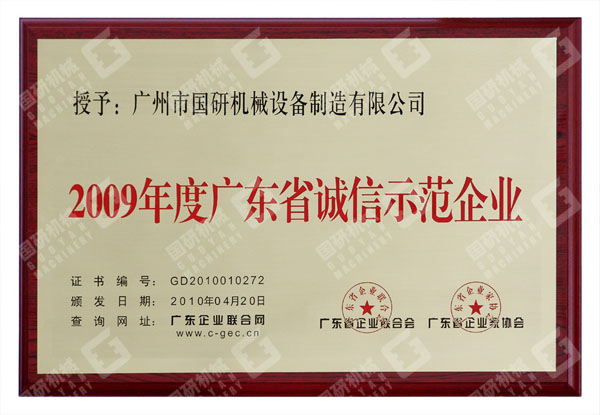 國研機(jī)械榮獲“2009年度廣東省誠信示范企業(yè)”稱號(hào)