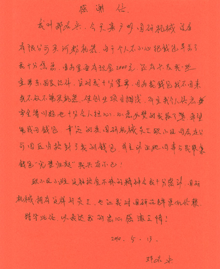 5月13日下午,一封署名為鄧名兵的感謝信送至公司領導手中,信中詳細描述了公司倉管員歐小鳳拾金不昧的感人事跡,請求公司對歐小鳳進行表揚,并感謝公司培養(yǎng)了歐小鳳這樣的好員工。