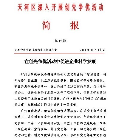 2010年10月13日,天河區(qū)區(qū)委區(qū)政府主辦的工作簡報(bào)第19期專題報(bào)道了我司黨支部在創(chuàng)先爭優(yōu)活動(dòng)中促進(jìn)企業(yè)科學(xué)發(fā)展的事跡。