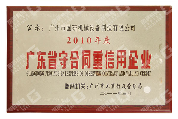 2011年4月,繼連續(xù)三年被評(píng)為“廣州市守合同重信用企業(yè)”之后,國(guó)研機(jī)械再獲殊榮,被評(píng)為2010年度“廣東省守合同重信用企業(yè)”。