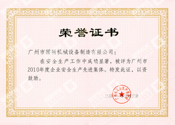 近日,在廣州市人民政府召開的安全生產(chǎn)工作總結(jié)暨表彰大會上再次傳來喜訊,廣州市國研機(jī)械設(shè)備制造有限公司被廣州市人民政府授予“廣州市2010年度企業(yè)安全生產(chǎn)先進(jìn)集體”榮譽(yù)稱號。這是我司獲得中華全國總工會和國家安全生產(chǎn)監(jiān)督管理總局授予2009年度全國“安康杯”競賽優(yōu)勝企業(yè)稱號后,被授予的又一殊榮。