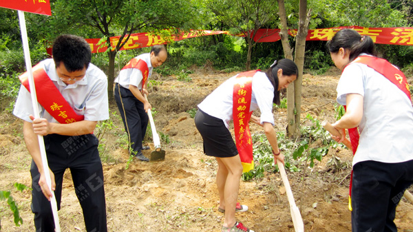 簡單的啟動儀式之后,大家高舉黨旗,直奔植樹活動現(xiàn)場。各位黨員、入黨積極分子不顧炎熱,二人或三人一組,互相配合協(xié)作,有的揮鍬填土、有的扶苗加固、有的提水澆灌,現(xiàn)場一派熱火朝天的景象。在大家的共同努力下,二百多棵樹苗很快栽植完畢,原本毫無生機的荒地轉(zhuǎn)眼已是綠意盎然。一場及時雨之后,小樹苗更是棵棵充滿生命的活力。
