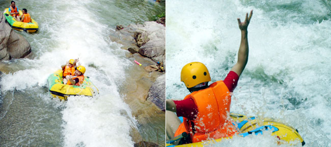 驚險漂流:沖下險灘、穿過水簾、飛越激浪、漂過深潭、擊水戲?!诩ち鞯淖矒粝?,歡笑尖叫,一往無前,讓大家的身心得到一次酣暢淋漓的釋放。